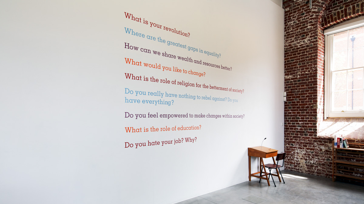 100 members of the public were invited to participate in the imagination of modern day revolutions. They were encouraged to describe the cause or structure they would like to transform, the motivating ideology for this change - including books that might have inspired their ideas, how they would mobilise others, the objectives of the revolution and how this would be achieved, i.e. through peaceful or violent means. The revolutions ranged from personal, social, cultural, philosophical, technological and political, covering subjects from housing, finance, debt, social welfare, education, animal rights and welfare, to the prison system.