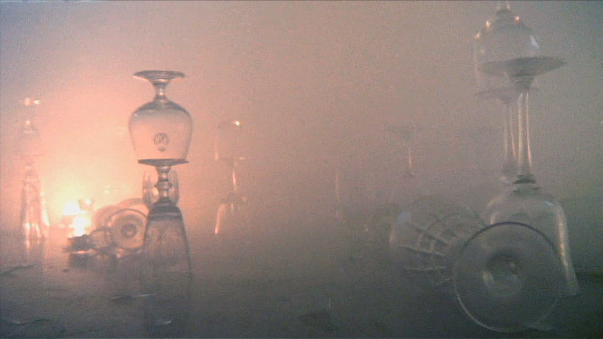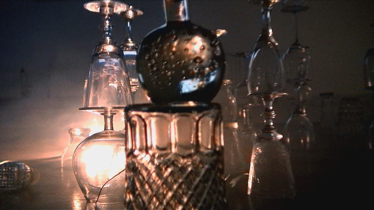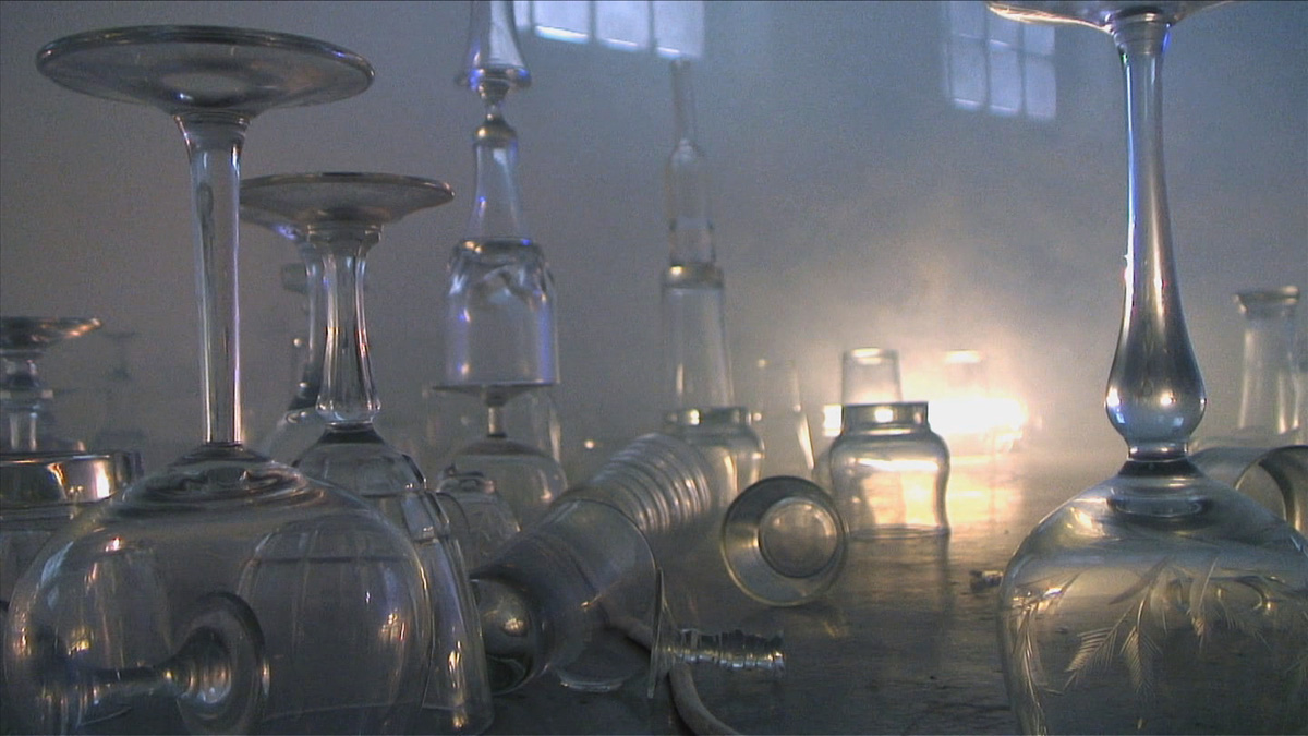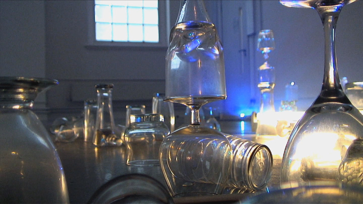 The audience is taken in unexpected directions, virtually knocking glasses down which shatter into pieces around them. The interaction of the video projection with the towers of glasses creates a further element - a silhouette of another uncanny cityscape.